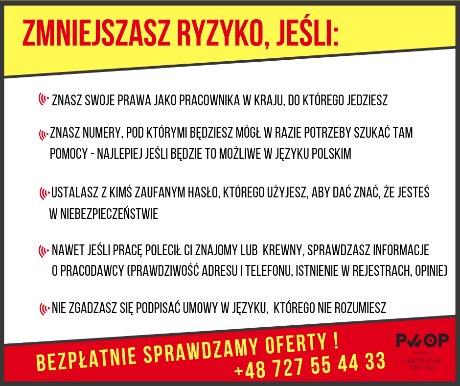 Poniżej przedstawiamy multimedialne plansze informacyjne dotyczące przeciwdziałania handlem ludźmi. Przestrzegają one osoby szukające pracy przed niebezpieczeństwami związanymi z handlem ludźmi oraz ryzykiem, jakie wiąże się z odpowiedzią na ogłoszenia nieuczciwych pracodawców lub przestępców udających pracodawców.