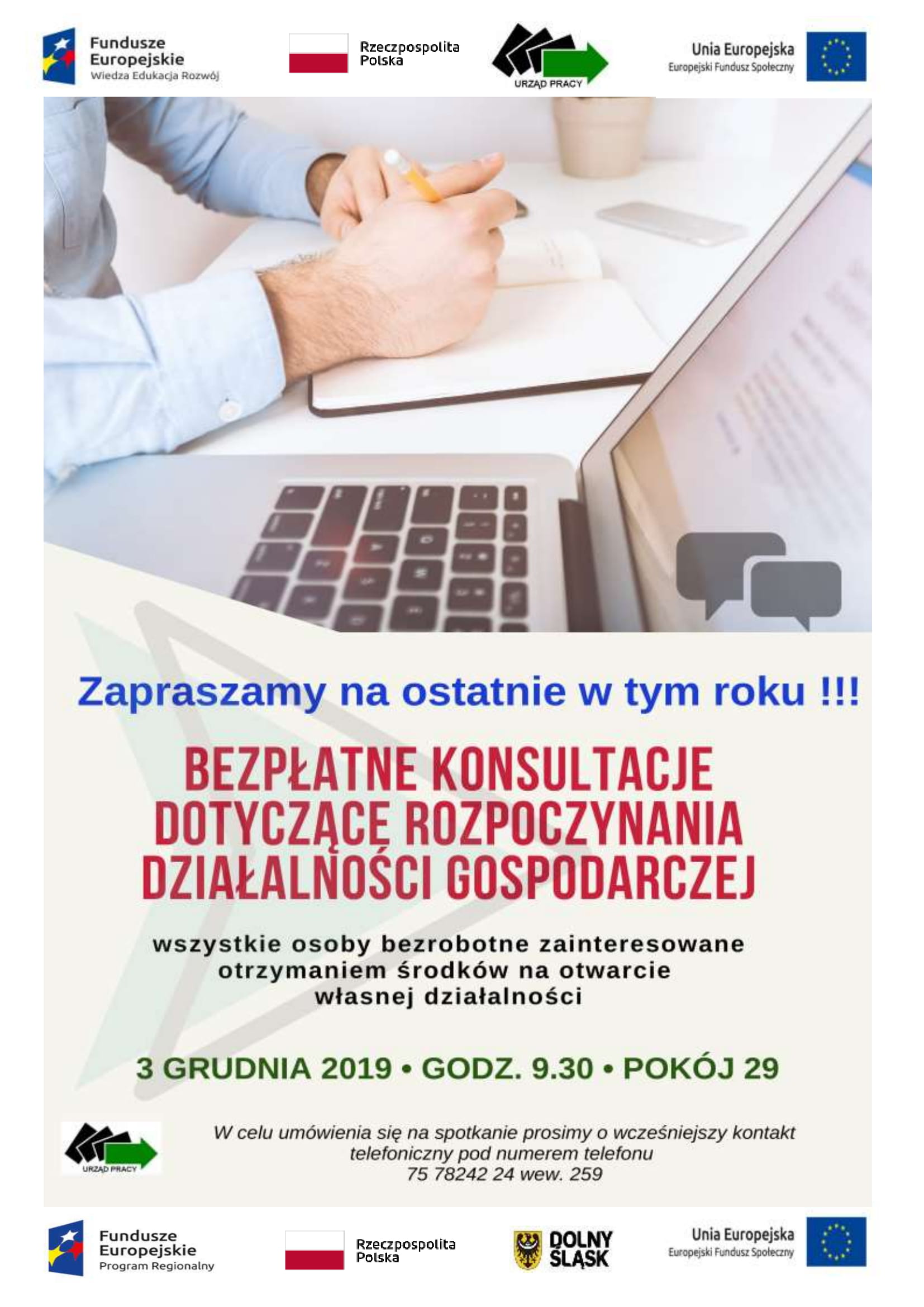 Powiatowy Urząd Pracy w Lwówku Śląskim zaprasza wszystkie osoby bezrobotne, zainteresowane otrzymaniem dotacji na rozpoczęcie działalności gospodarczej w dniu 3 grudnia 2019r. o godz. 9.30 do sali konferencyjnej (pok.29) na bezpłatne konsultacje dotyczące rozpoczynania działalności gospodarczej.