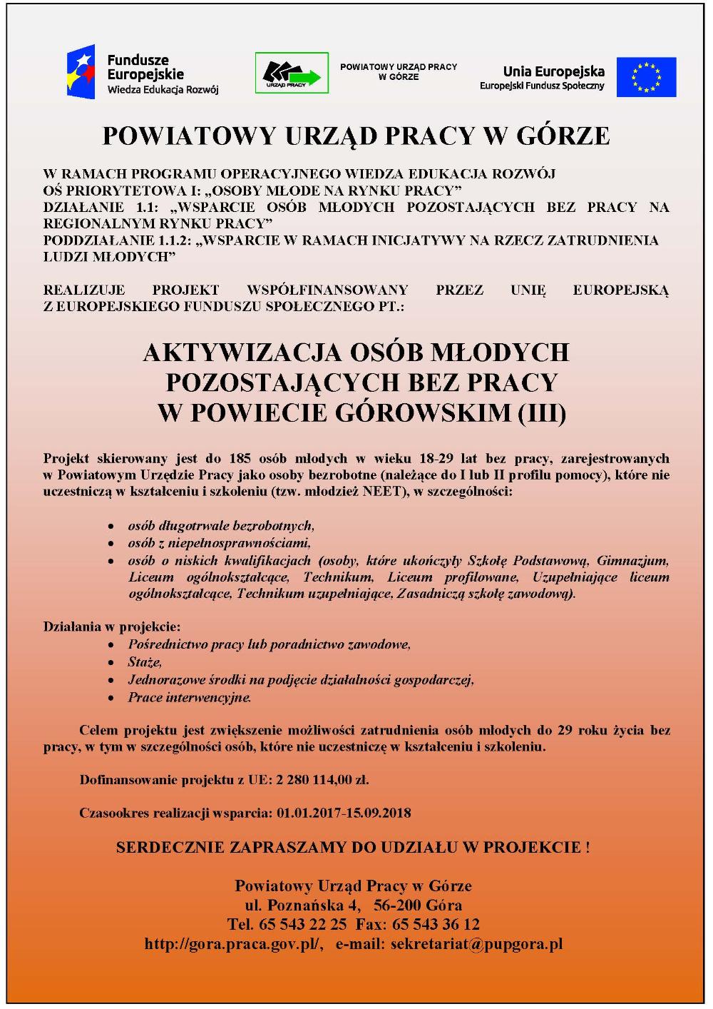 Projekt pt. "Aktywizacja osób młodych pozostających bez pracy w powiecie górowskim (III)" w ramach Poddziałania 1.1.2 PO WER w 2017 roku